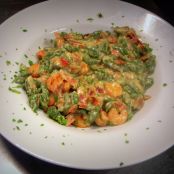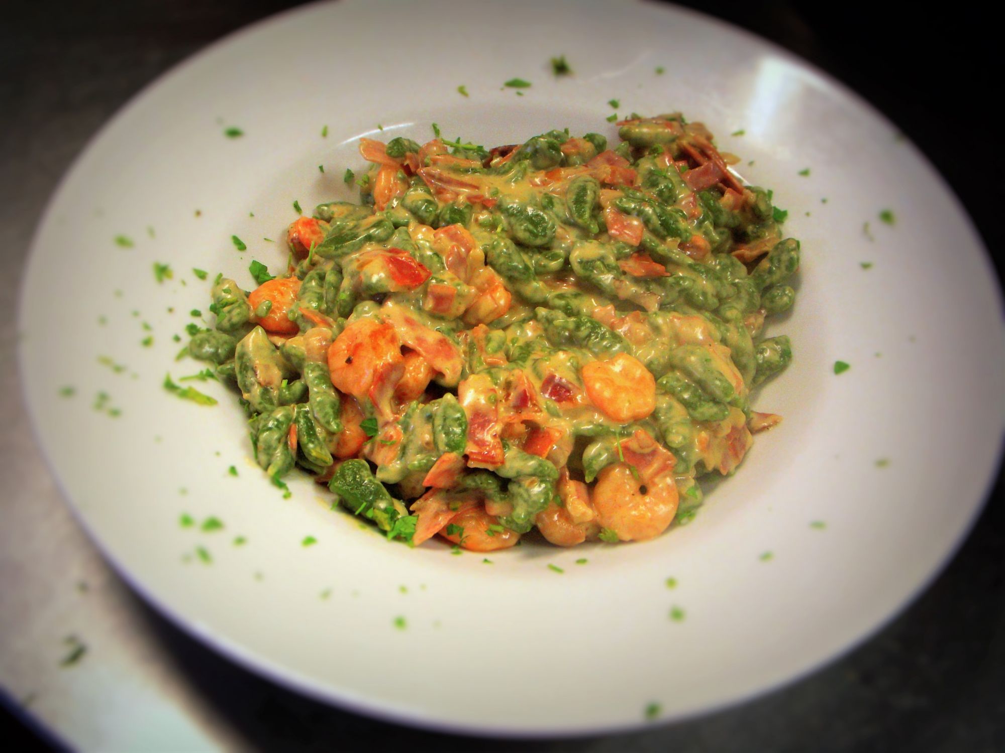 Spatzle di spinaci con gamberetti, speck e panna