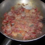 Mettete in una pentola dell'acqua a bollire sul fuoco. Prendete poi una padella capiente e scioglieteci dentro il burro, dopodiche' aggiungeteci la cipolla e lo speck e fate cuocere il tutto. Appena vedete che lo speck e la cipolla iniziano ad arrosolarsi aggiungeteci i gamberetti e continuate la cottura ancora per qualche minuto.