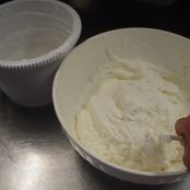 Montate poi la panna fresca a neve e mettete il mascarpone in una insalatiera capiente. Montatelo per qualche minuto aggiungendoci lo zucchero a velo e, appena finito di montare, aiutandovi con una spatola, amalgamateci la panna precedentemente montata e la vanillina.