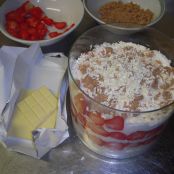 Lasciando da parte due o tre fragole per le decorazioni finali, lavate e tagliate meta' delle restanti fragole a fettine e l'altra meta' a cubettini. Nel frattempo mettete in un contenitore il succo di frutti rossi.
