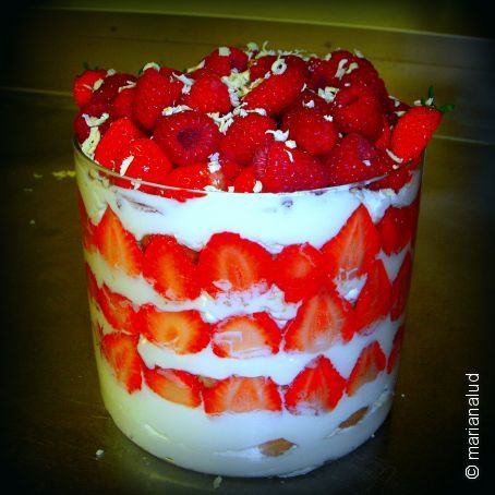 A questo punto potete iniziare a comporre il dolce. In un contenitore di vetro, adagiate sul fondo per prima cosa uno strato di crema al mascarpone. Incastrandole poi sulla crema, tutto giro giro intorno al vetro del contenitore, appoggiate le fettine di fragole tagliate in precedenza, aiutandovi anche per farle stare in verticale con uno strato di savoiardi bagnati, prima di adagiarli sulla crema, con il succo di frutti rossi. Fatta questa operazione aggiungete sopra ai savoiardi un altro strato di crema al mascarpone e su di essa cospargete un po' delle fragole tagliate a cubettini. E cosi' via. Ripetete queste operazioni fino al riempimento del recipiente di vetro e finite il tutto decorando con della frutta fresca e dei riccioli di cioccolato bianco.