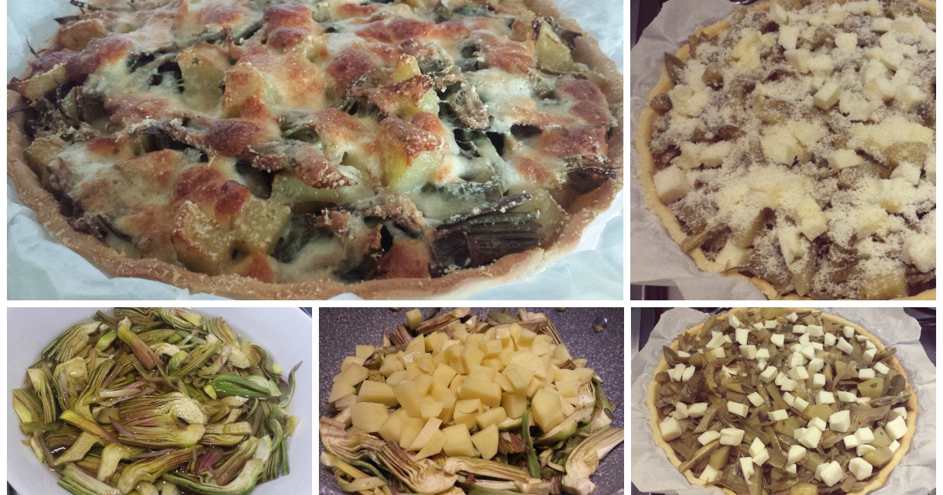 Unire lo speck e la provola ai carciofi con patate, versare il tutto all’interno della brisè