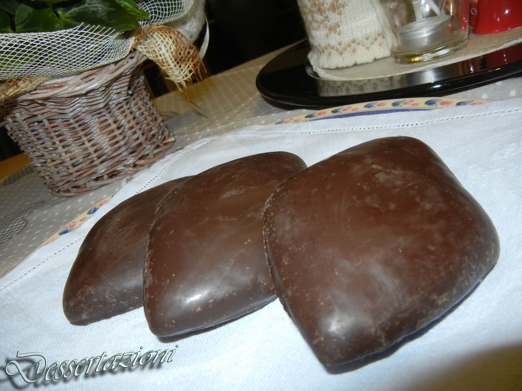 Per un risultato meno rustico, immergere i mostaccioli nel cioccolato e non spennellarli...