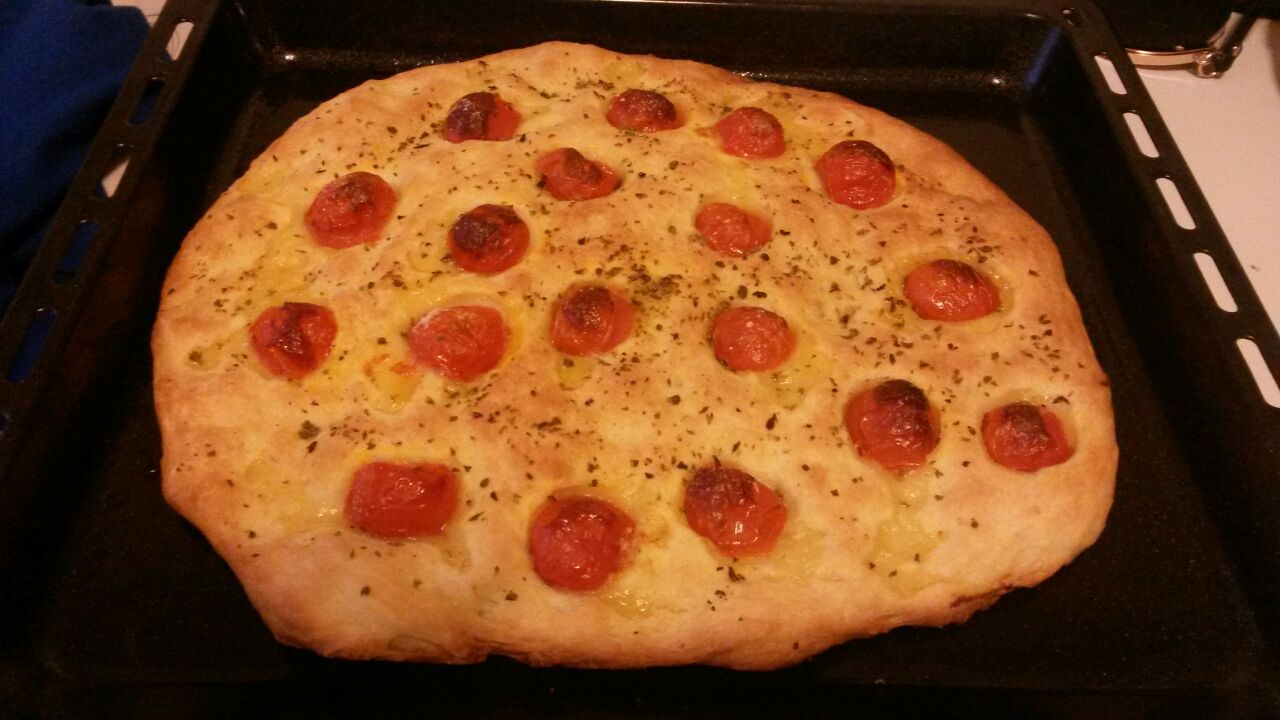 A questo punto stendere l’impasto in una teglia unta e formare la nostra focaccia, aggiungere pomodorini tagliati a metà, l’origano, una passata di olio e salare a piacere.