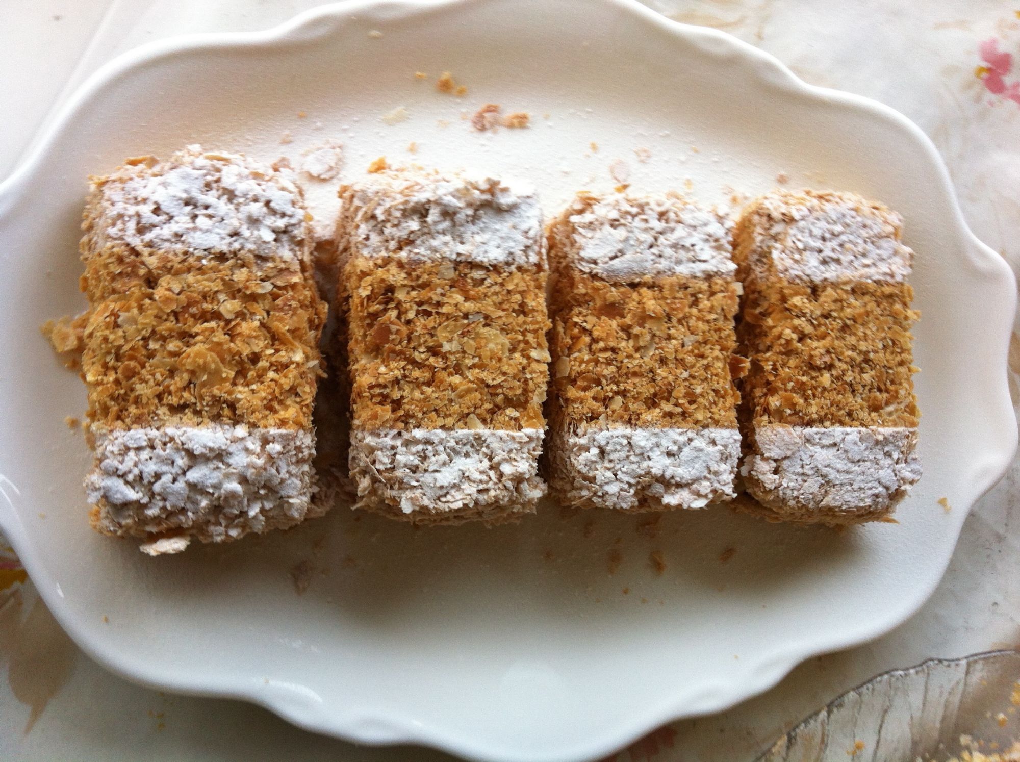 Tagliate i dischi di pasta sfoglia rettangolare tutti uguali, usando anche i ritagli di pasta, che ci serviranno per la copertura. Bucherellate i rettangoli, pennellateli d'acqua, spolverizzateli di zucchero semolato, quindi sulla placca deformo coperte da carta forno e cuocerei a 200° per 12' circa, così tutti i tre rettangoli di pasta, lasciare raffreddare.