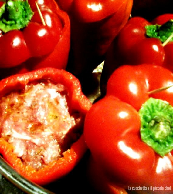Farciamo con il composto i peperoni, inizialmente senza riempirli troppo per assicurarci che la quantità sia sufficiente, solo dopo averli riempiti tutti suddividiamo tra i peperoni quello avanzato. Chiudiamo ogni peperone con la sua calotta fermandola con degli stecchini, è importante che i peperoni rimangano dritti, cioè con la calotta rivolta verso l'alto, durante la cottura quindi dovrete trovare una pentola delle giuste dimensioni e solo dopo averli sistemati bene versiamo sul fondo della pentola l'olio, aggiungiamo 1 bicchiere d'acqua ed un pizzico di sale.