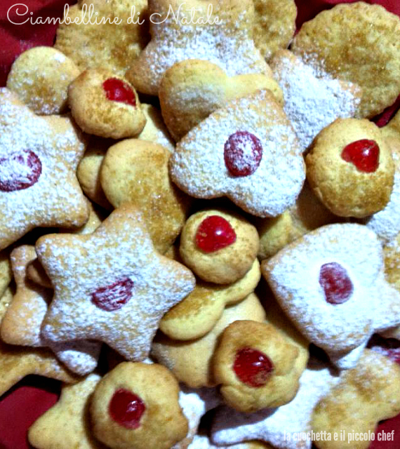 Formiamo velocemente una palla, cercando di lavorarla il meno possibile. Accendiamo il forno a 180°, cospargiamo di farina sia la spianatoia che il mattarello, prendiamo parte dell'impasto e stendiamo una sfoglia alta mezzo centimetro circa. Con degli stampini o con un bicchiere formiamo delle ciambelline e mettiamo al centro di ognuna una ciliegia candita.