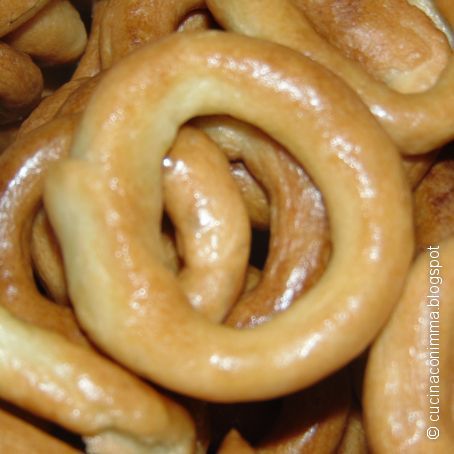 Fate bollire in una pentola l'acqua e versatevi i taralli pochi alla volta ; appena vengono a galla scolateli e poneteli su di un canovaccio.