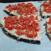 Tagliare i pomodorini a cubetti e disporli sulle fettine;