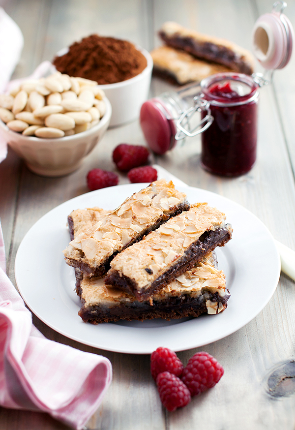 Barrette al cioccolato con confettura al lampone e pasta di mandorle
