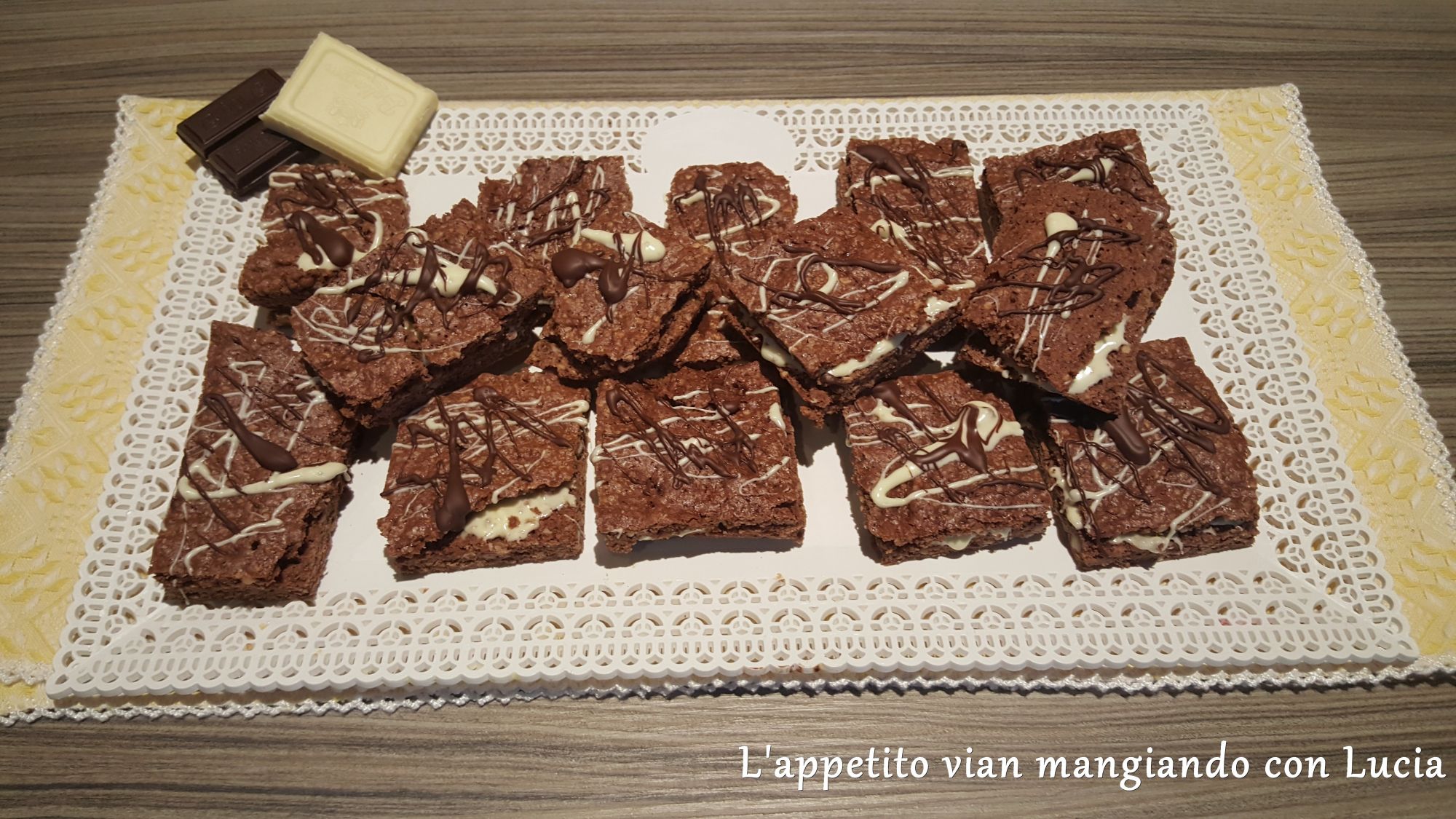 Una volta fredda, tagliatelo a metà facendo attenzione a non romperlo, (come invece ho fatto io :-) ) e spalmate sulla parte inferiore parte del cioccolato bianco fuso a bagnomaria. Coprite con la parte superiore e create dei ghirigori con il cioccolato fondente e il cioccolato bianco fuso rimasto. Tagliatelo a pezzi più o meno uguali e servite.