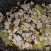 Tagliare lo scalogno e la melanzana in cubetti piuttosto piccoli e farli rosolare entrambi in una padella con l’olio.