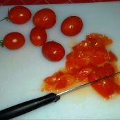 Aggiungere i pomodorini, tagliati in pezzi di dimensioni pari ai cubetti di melanzana.
