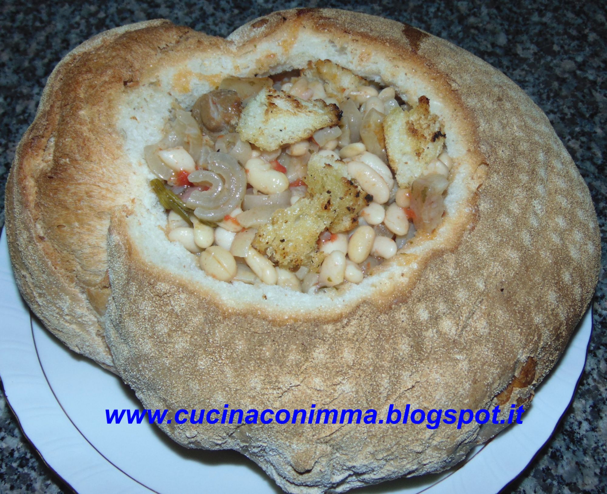 Una volta cotto lasciate intiepidire , ed iniziate a svuotare il pane . la mollica non va gettata, ma tagliata a cubetti e tostata in padella , una sorta di crostini da unire ai fagioli.