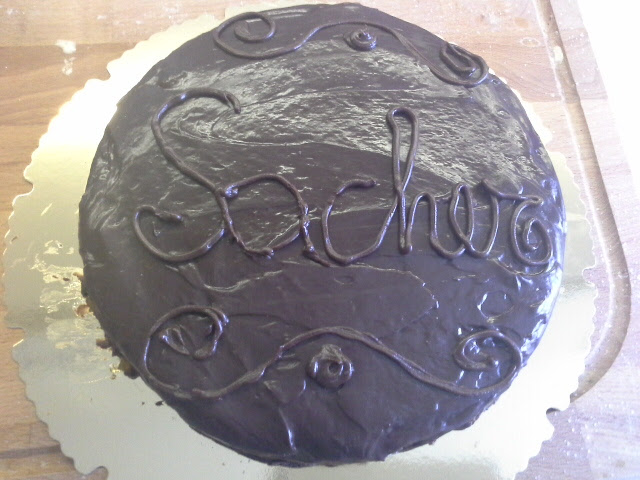 coprite con la ganasche e mettete in frigo, con la cioccolata avanzata e una sac a poche quando la copertura si sarà solidificata scrivete sacher. rimettete in frigo.