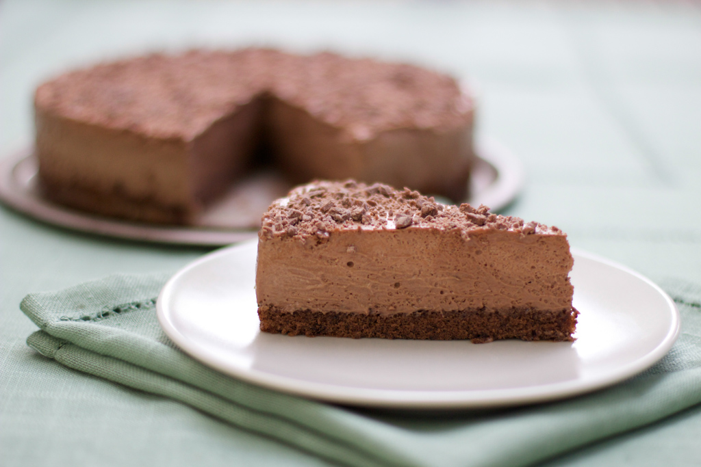 Componete il dolce: togliete la cerniera e tagliate lo strato superiore della torta, per permettere alla bagna di essere assorbita meglio. Spennellate la base con la bagna, rimettete la cerniera e coprite la base con la mousse al cioccolato. Mettete la torta in frigorifero per almeno 8 ore.