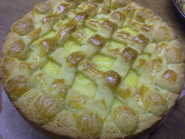 riprendete la pasta frolla dal frigo 3/4 stendetela in una teglia a cerniera facendo anche il bordo, mettete la crema e con l'altra pasta fate delle striscioline e incrociatele sopra la crema se vi avanza della pasta fate delle pallini e mettetele distanziate lungo il bordo, poi con una forchetta tirate giù il bordo e incidete piano le palline. con il tuorlo colorate la pasta prima di infornare