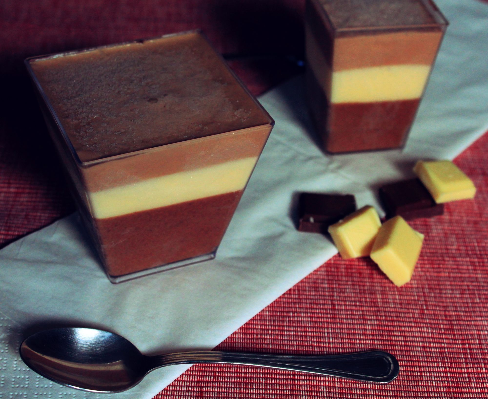 Versare il composto al cioccolato fondente nei bicchierini monoporzione. Far solidificare in freezer (almeno 30 minuti) prima di procedere con il cioccolato bianco e infine con il cioccolato al latte.