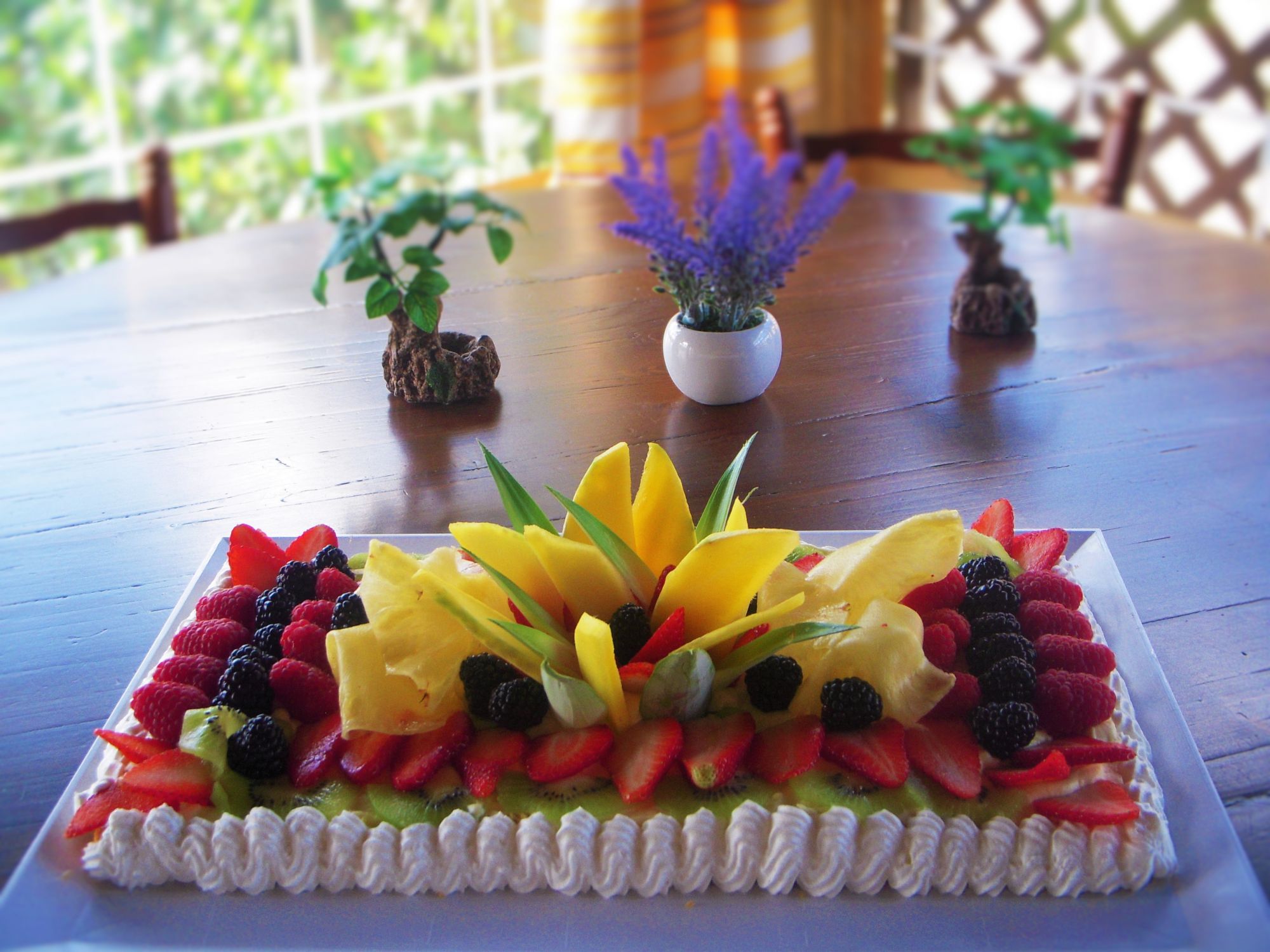 Dividete la base della torta oramai raffreddata, in due e bagnatela con un sciroppo fatto con acqua e zucchero. Riccoprete una delle basi con una parte di crema chantilly gia' fatta e appoggiate l'altra base sopra. Rivestite la torta con la restante crema. Distribuite armoniosamente la frutta tagliata a pezzi, sopra la torta. Rivestite i bordi con dei ciuffetti di panna montata.