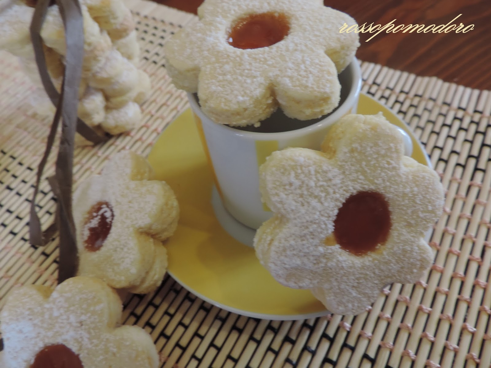 Stendete la frolla a uno spessore di 4mm e ricavate con una formina dei fiori. Sulla metà dei biscotti praticate con un piccolo coppapasta circolare un buco. Disponeteli su una teglia ricoperta da carta da forno. Mettete al centro del fiore della marmellata di albicocche e richiudete con il biscotto bucato. Infornate a 180° per circa 20 minuti. Una volta cotti spolverizzate con dello zucchero a velo.