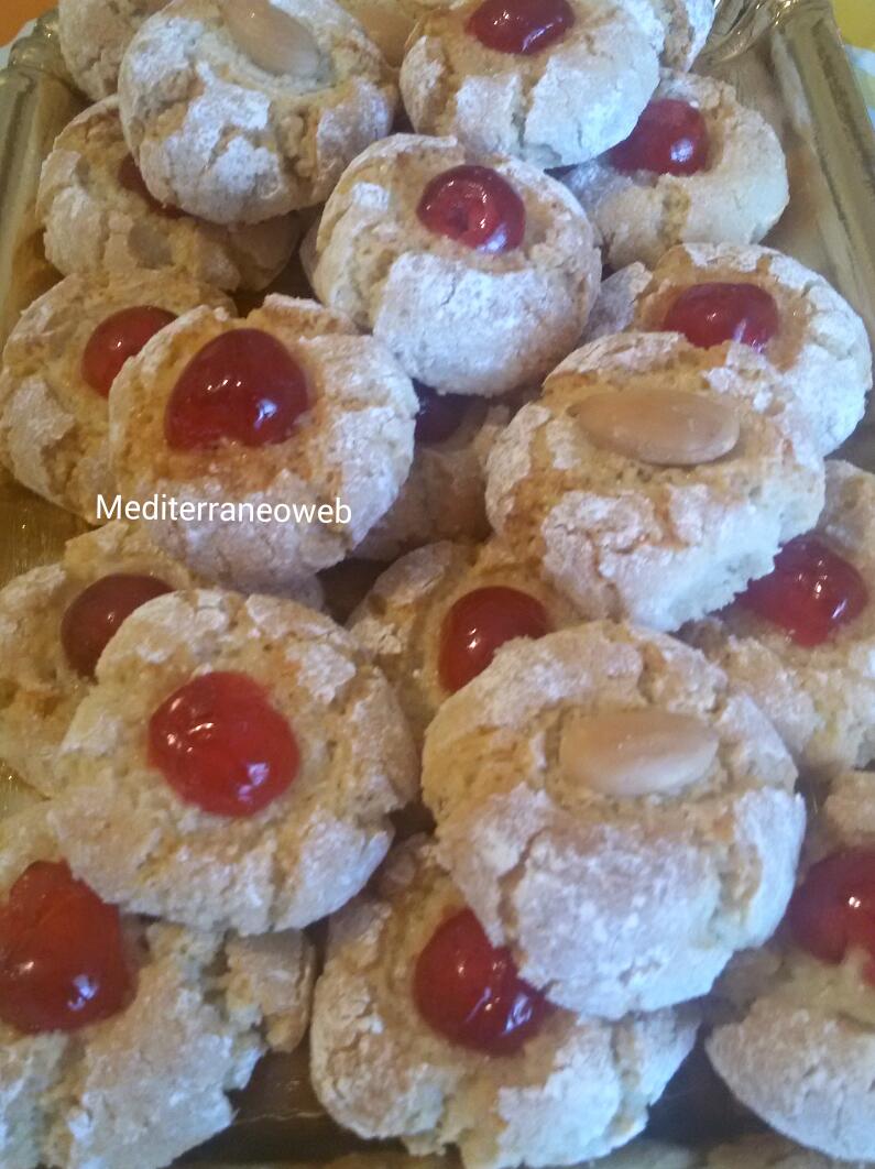 Frullare le mandorle ed ottenere una farina, unire lo zucchero gli albumi e le gocce di essenza, mescolare con una palettina ed ottenere un composto omogeneo, fare delle palline della grandezza di una noce infarinare con lo zucchero a velo e sistemare in una teglia con carta da forno, poggiare ad ognuna le ciliegie con una leggera pressione, infornare a 175 gradi per 12/13 minuti, fare raffreddare completamente prima di servire.