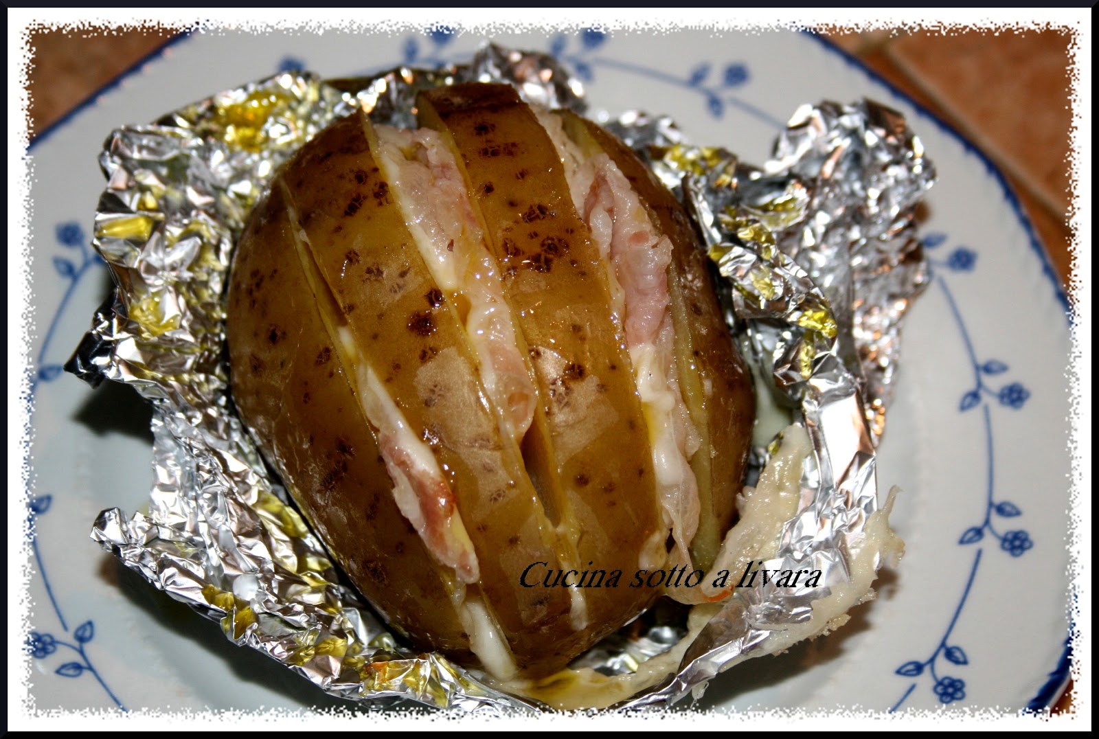 Toglietele dal forno e se volete gustarle calde , aiutatevi con un guanto a togliere la carta , ma non tutta , lasciatela come se dovesse fare da cestino alla patata .