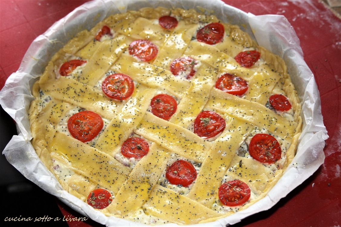 Con l'altra metà fate delle strisce e mettetele sopra la torta , assieme ai pomodorini e il pizzico di origano.