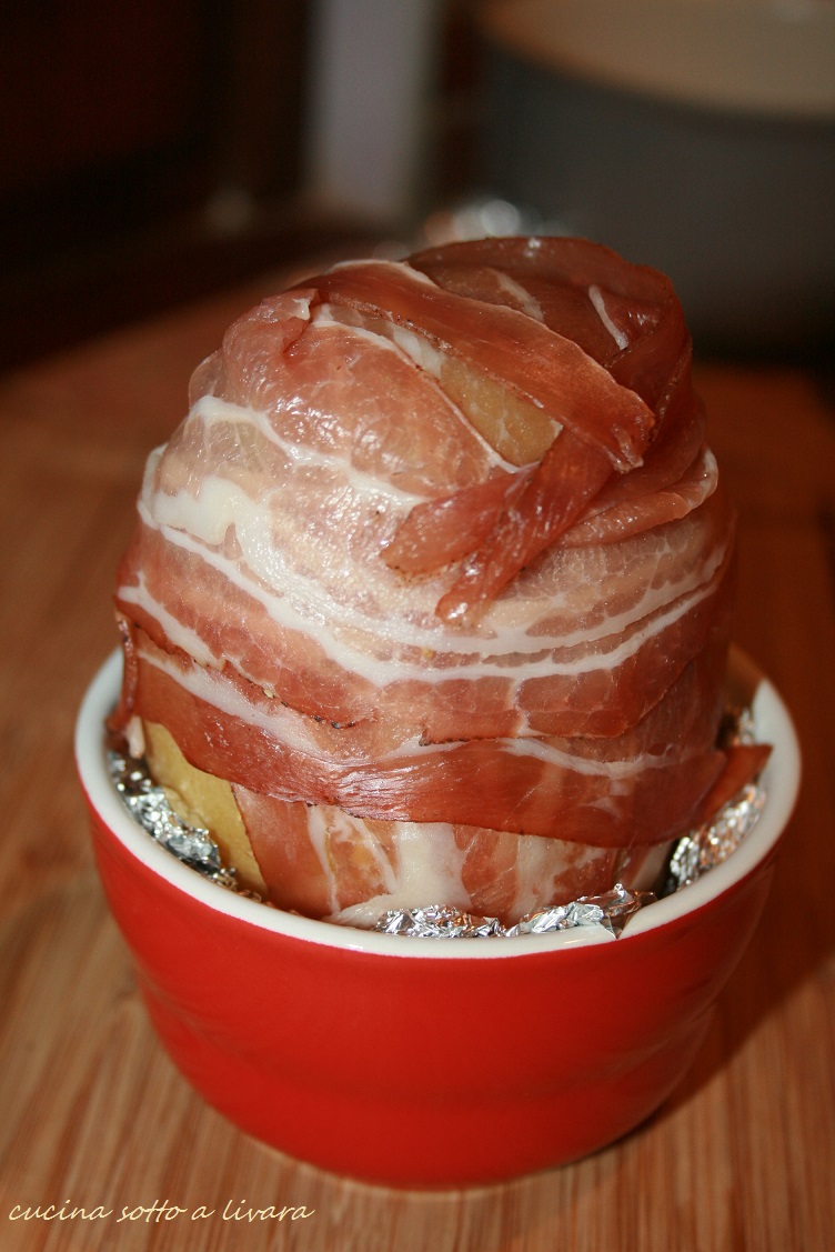 Rimettete sopra ogni patata la propria calotta , e avvolgete ogni patata con la pancetta.