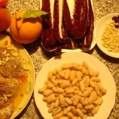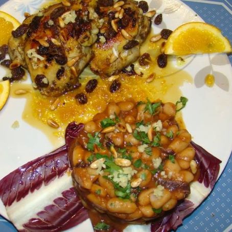 sovracosce di pollo con zenzero e pinoli,uvetta passa,alla crema d'arancio con cannellini su letto di radichio rosso.