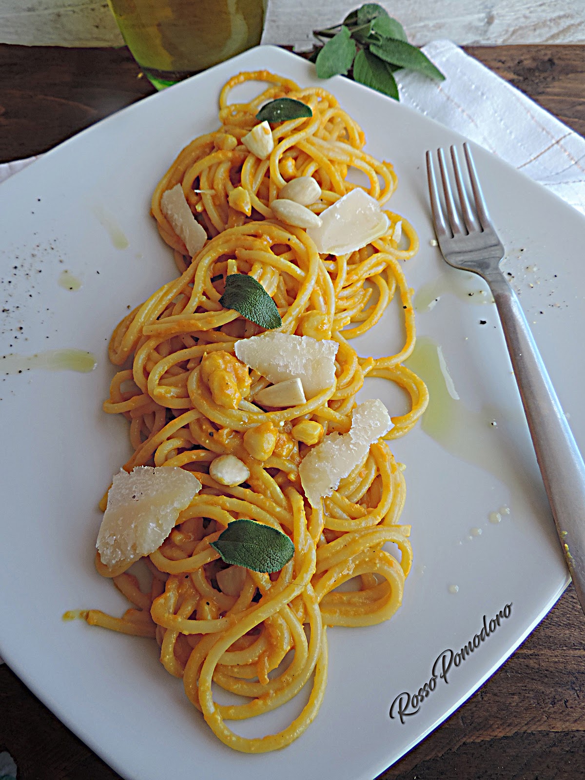 Condire gli spaghetti con abbondante parmigiano grattugiato, decorare con qualche fogliolina di salvia, qualche mandorla intera, scaglie di parmigiano e infine un filo d'olio e una spolverata di pepe.