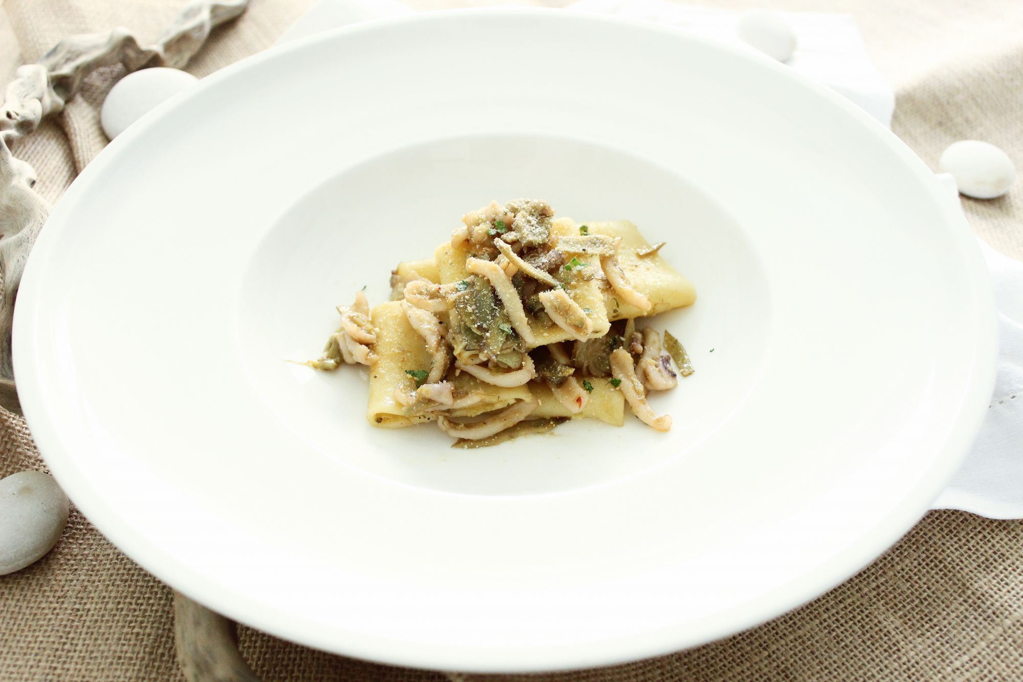 Iniziate sfogliando i carciofi fin dove le foglie non saranno chiare e tenere. Tagliatene l’apice, divideteli a metà ed eliminate la barbina. Riduceteli in pezzi grossolani.Sbucciate l’aglio, schiacciatelo e mettetelo in una casseruola con un filo diolio d’oliva extra vergine. Mettete sul fuoco. Quando l’olio sarà caldo aggiungete i carciofi.Fate rosolare per qualche minuto poi sfumate con il vino bianco, salate e pepate. Aggiungete anche l’anduia. Copriteli e stufateli a fuoco dolce per 10\12 minuti. Controllate la cottura, se si asciugano troppo aggiungete un goccio di acqua. Lavate e sgocciolate in un scolapasta i calamari. Poi Apriteli a libro e tagliateli a striscioline. Conditeli con un filo di olio e un pizzico di sale. Rosolateli in padella per 1 minuto. Tritate la menta con il prezzemolo e aggiungeteli al pangrattato e alla mollica di pane sbriciolata in una padella antiaderente. Aggiungeteun filo di olio, mescolate e fate imbrunire per circa 3 minuti a fuoco medio. Quando i carciofi saranno pronti, prelevatene tre cucchiai e frullatelicon un goccio di acqua e un filo di olio. Poi riunite la purea ai carciofi. Unite anche i calamari.