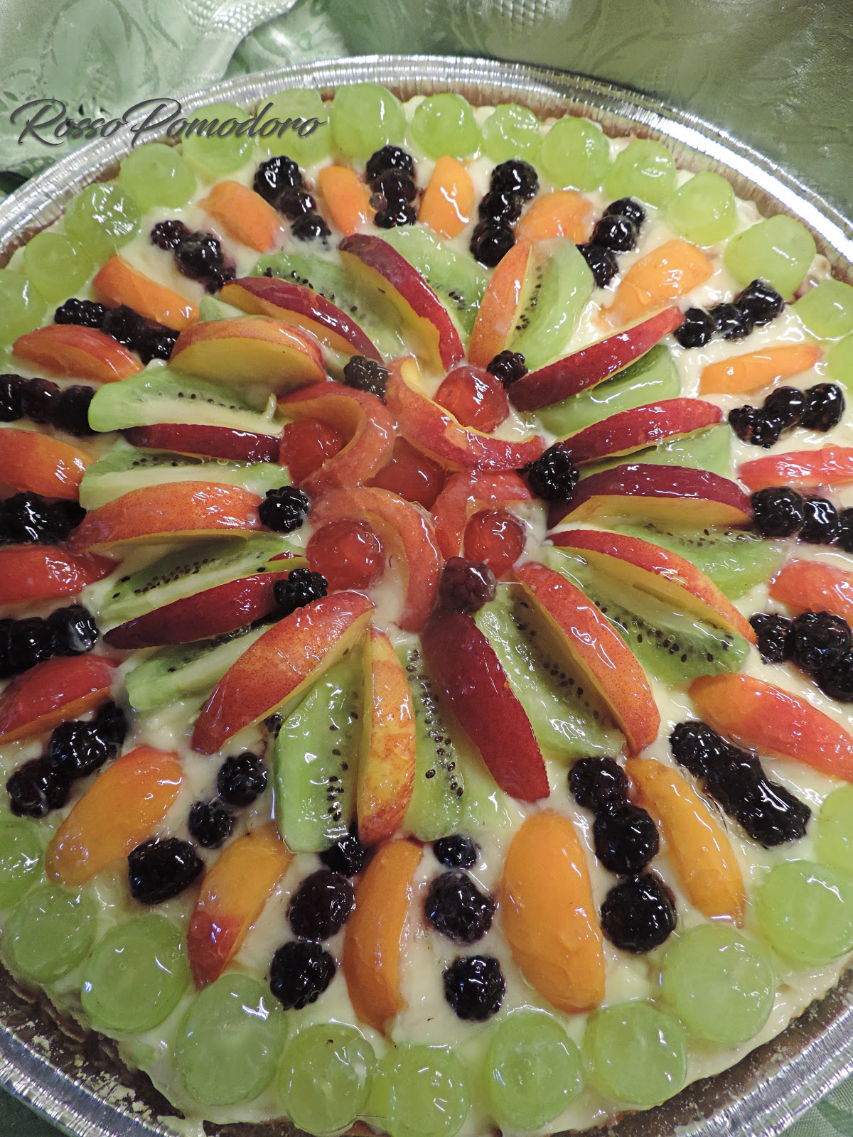 Fresca e golosa crostata di pasta frolla con crema pasticcera e frutta.