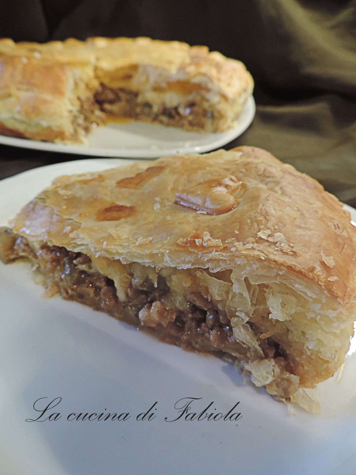 Saporita torta salata ripiena con carne trita di manzo, melanzane, mozzarella e parmigiao grattug