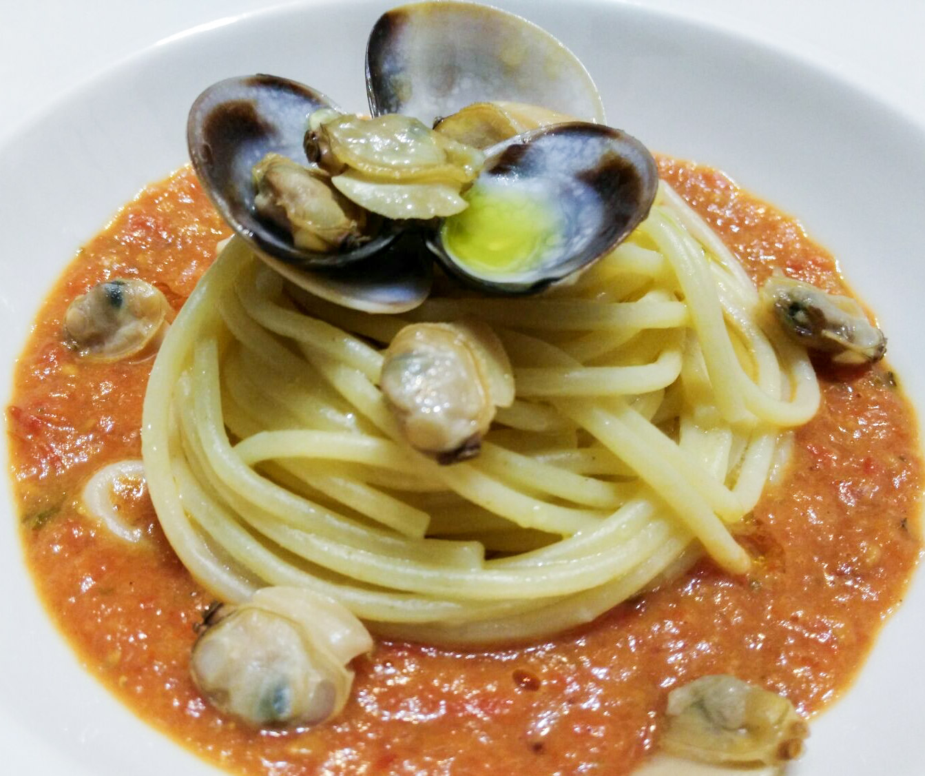 Cuciniamo gli spaghetti ben al dente, togliamo e mettiamo da parte una buona quantita di vongole con il loro guscio. Tritiamo con il mixer a immerzione i pomodorini fino ad ottenere una salsa e mettiamola da parte.