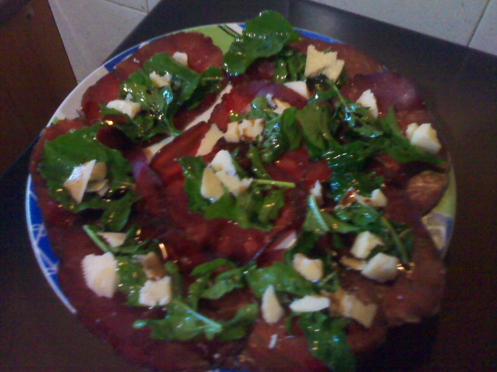 Carpaccio di pere forelle dure con scaglie di grana, susine e balsamico