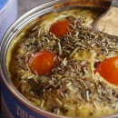 Terminate disponendo 3 pomodorini sulla superficie di entrambe le scatolette. Spolverate con le erbe aromatiche.