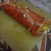Battere un po' la carne e farcirla con uno strato di mortadella e uno di pancetta