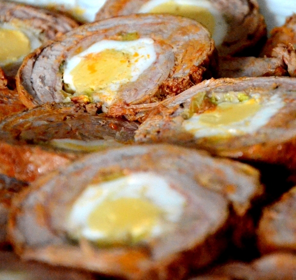 - 400 gr fesa di vitello aperta a libro, 200 gr mortadella, 100 gr pancetta, 80 gr macinato, 200 gr salsiccia, 60 gr pecorino, 1 uovo, 80 gr piselli, caciocavallo, 4 uova sode, olio extravergine d'oliva, 1 spicchio d'aglio, 1/2 cipolla, 1 bicchiere di vino rosso, 1 cucchiaio di concentrato di pomodoro, acqua o brodo vegetale