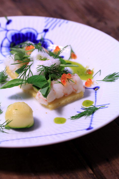 Canapè di polenta agli scampi e schiuma di latte