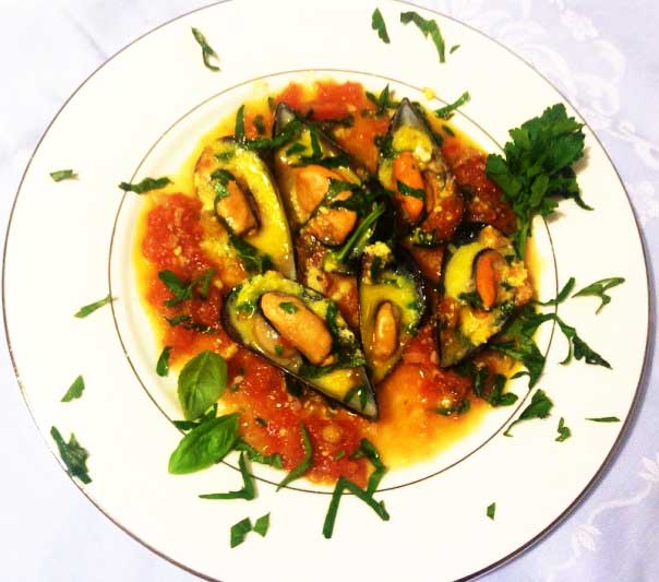 Aprire le cozze. Preparare il ripieno con pane, formaggio, uovo, sale, prezzemolo, olio e aglio