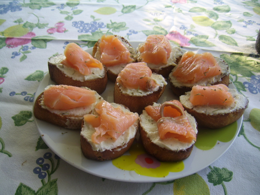 Crostini di ricotta aromatizzata al pesto, rughetta e salmone affumicato