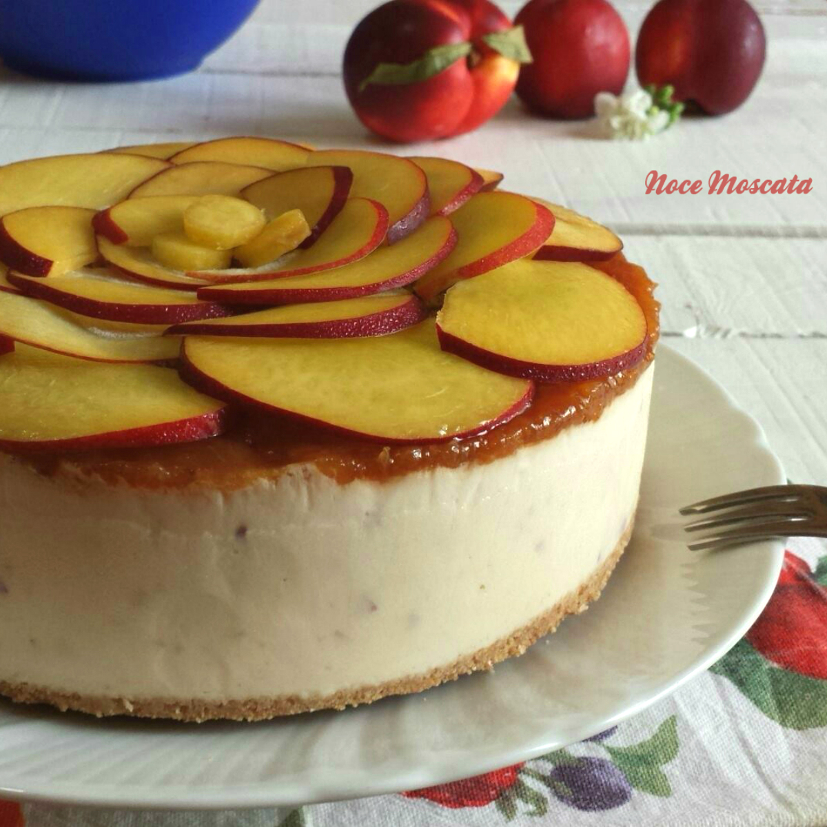 Cheesecake semifredda, con pesche frullate all’interno e fettine fresche per la decorazione