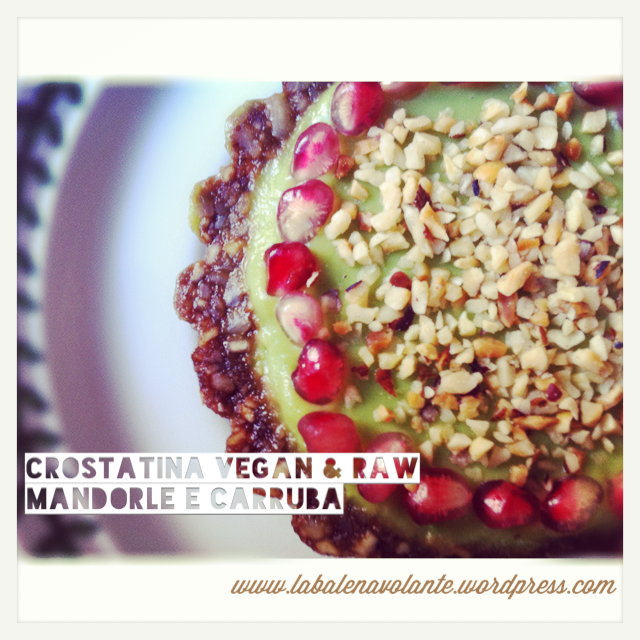 Crostatina crudista vegana con carruba, mandorle e mousse di avocado e lime