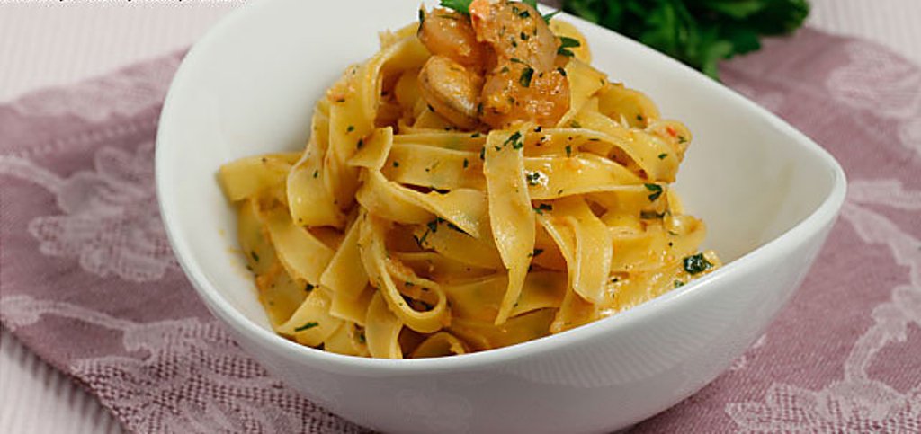 Le fettuccine con crema di gamberetti e brandy sono un primo piatto di pesce molto raffinato, dal delicato colore r...