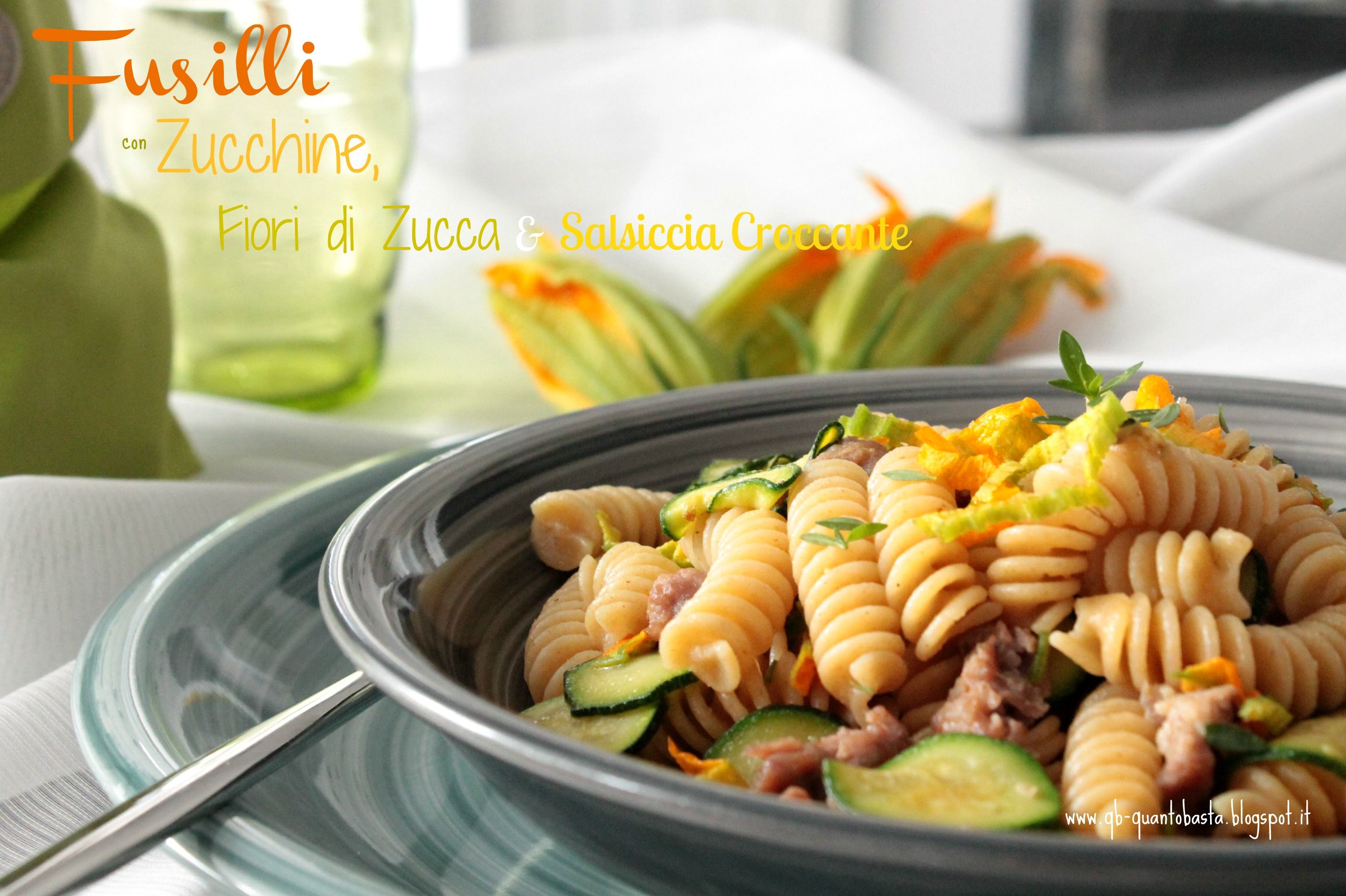 Fusilli integrali con sugo di zucchine, fiori di zucca e salsiccia croccante