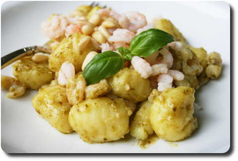 Gnocchi al pesto, gamberetti e pinoli