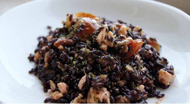 Riso nero venere con salmone affumicato e pomodorini freschi