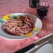 Linguine paglia e fieno con cubetti di pollo e pesto di melanzane