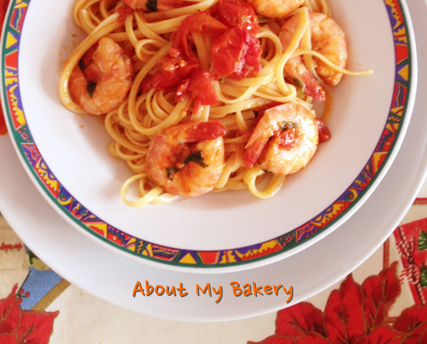 - 400 g di linguine, 800 g di mazzancolle, 300 g di pomodorini maturi o barattolo di pelato di pomodorini, peperoncino piccante, due spicchi d’aglio, 1/2 bicchiere di vino bianco.