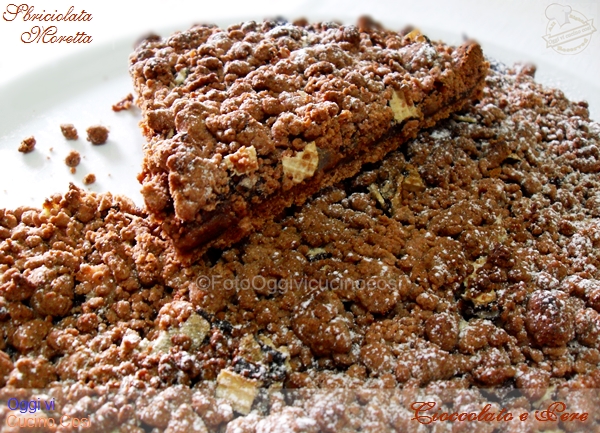 La Torta Sbriciolata Moretta con crema al cioccolato e pere, ha un guscio croccante al cioccolato, ripiena di crem...